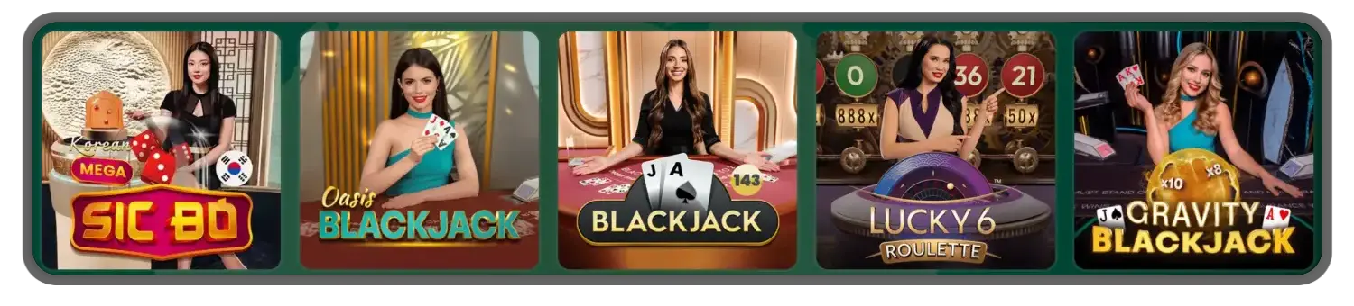Actions from all our 120+ live titles are streamed live on HD cameras with sound. The titles here maintain their basic rules, but some additional twists or features keep them more exciting. Deuces Wild, Oasis Blackjack, No Commission Baccarat and Gravity Roulette are some of the available options.